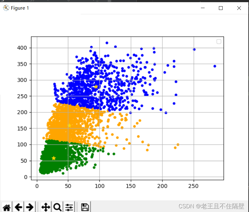 plt.scatter(self.km.cluster_centers_[:, 0], self.km.cluster_centers_[:, 1], s=50, marker="*", c="gold")#五角星大小颜色设置