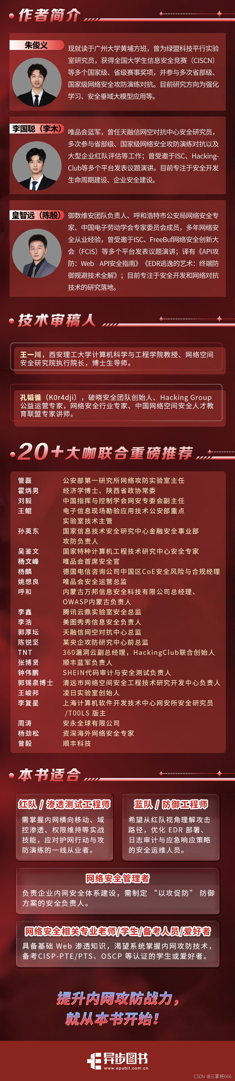 接下来给大家推荐一本关于内网攻防的书籍,这是一本从红队视角系统梳理内网渗透与防御实战技巧的干货图书,一经上市就登上了当当“计算机与互联网”图书排行榜前列。本书从内网攻击面剖析讲起到攻防对抗体系建设,助企业在日常安全运营中提前发现威胁、精准溯源、快速止血!另外,关注本文博主,点赞+收藏本文,且在本文评论区评论“入手内网攻防”,将选取三名幸运读者送出纸质版《内网攻防实战图谱:从红队视角构建安全对抗体系》一本,截止时间:2025.10.19。入手《内网攻防实战图谱:从红队视角构建安全对抗体系》传送门: https://item.jd.com/14526651.html 或者 https://product.dangdang.com/29944413.html ,个人觉得这本书非常的不错,是一本不可多得的好书,值得拥有去学习。