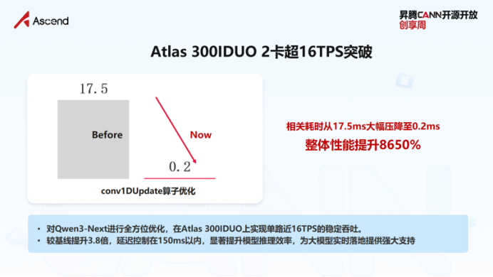 面对这款紧凑型硬件,标准算子库无法发挥极致性能。清昴团队通过Ascend C重写了Decode阶段的关键算子Conv2D Update,将该算子的性能提升了百倍,最终带动整网推理收益提升了15%,实现了单路16 TPS的流畅体验。
