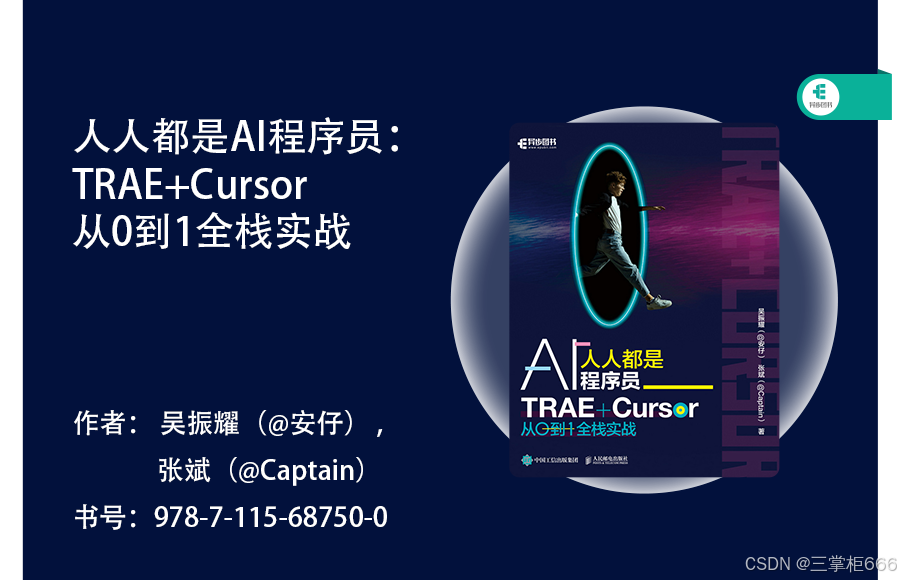 接下来给大家推荐一本关于AI编程的书籍《人人都是AI程序员:TRAE+Cursor从0到1全栈实战》,这是一本聚焦TRAE与Cursor工具、从0到1指导全栈AI编程实战的实用图书,一经上市便受到AI编程学习者和全栈开发从业者的广泛关注。本书从TRAE与Cursor的基础操作讲起,逐步深入全栈AI编程的实战技巧,助力读者轻松掌握从需求分析到项目落地的全流程,无论是零基础的编程入门者还是希望提升AI编程效率的开发人员,都能从中获得实用指导!另外,关注本文博主,点赞+收藏本文,且在本文评论区评论“入手AI程序员”,将选取三名幸运读者送出纸质版《人人都是AI程序员:TRAE+Cursor从0到1全栈实战》一本,截止时间:2026.02.13。入手《人人都是AI程序员:TRAE+Cursor从0到1全栈实战》传送门:https://item.jd.com/14628651.html 或者 https://product.dangdang.com/30003315.html ,个人觉得这本书非常的不错,是一本针对AI编程入门与实战的优质书籍,堪称不可多得的学习资料,值得每一位想要涉足AI编程领域或提升全栈开发能力的读者拥有并深入学习。