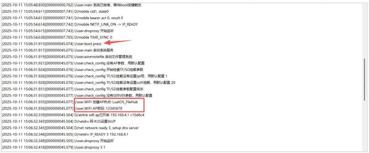 观察串口日志,等待"系统已就绪,等待 boot 按键触发"的提示