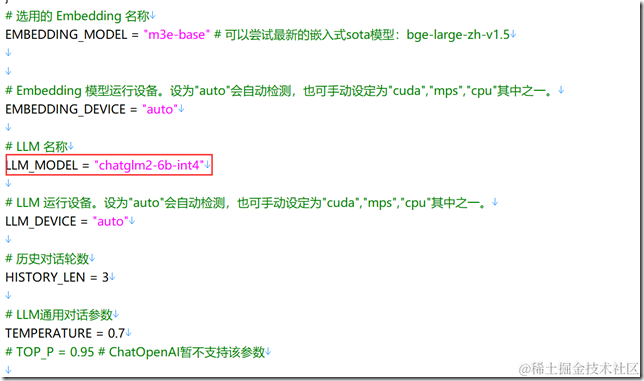 然后修改 model_config.py,修改 LLM 模型名称(注意上面 MODEL_PATH 的 llm_model 里指定了 chatglm2-6b-int4 模型的路径,需要的话可以自己修改模型路径)