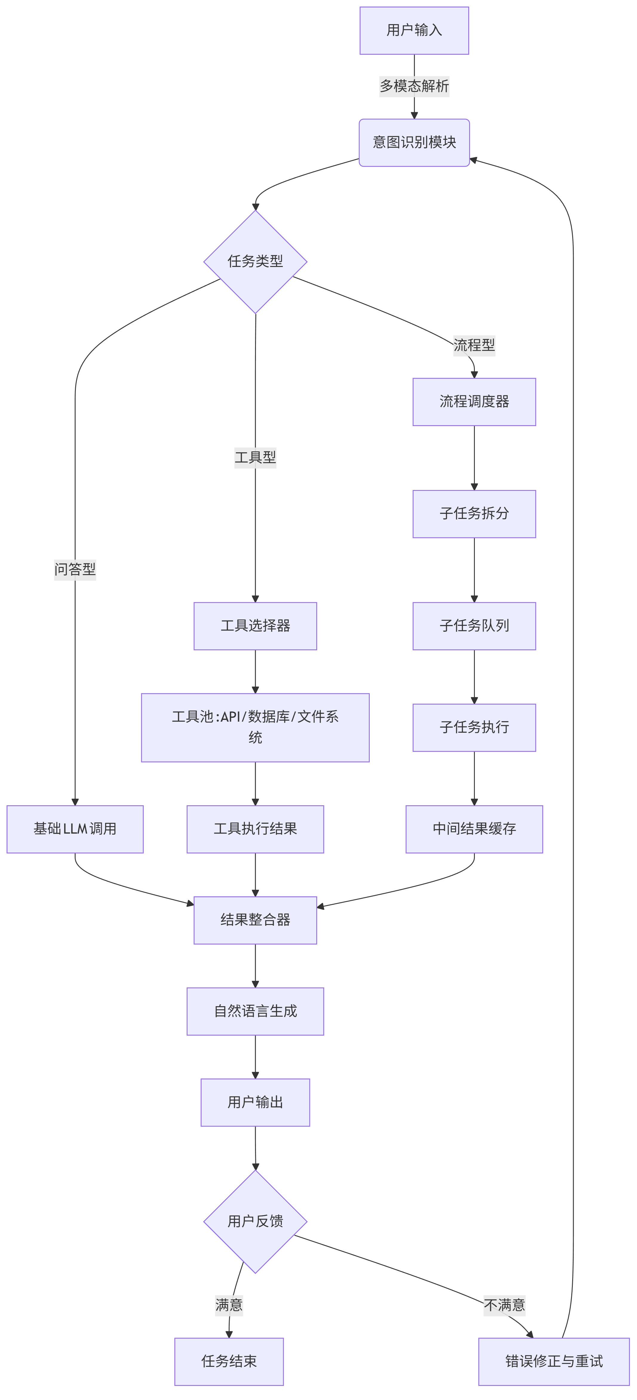graph TD A[用户输入] -->|多模态解析| B(意图识别模块) B --> C{任务类型} C -->|问答型| D[基础LLM调用] C -->|工具型| E[工具选择器] C -->|流程型| F[流程调度器] E --> G[工具池:API/数据库/文件系统] G --> H[工具执行结果] F --> I[子任务拆分] I --> J[子任务队列] J --> K[子任务执行] K --> L[中间结果缓存] D & H & L --> M[结果整合器] M --> N[自然语言生成] N --> O[用户输出] O --> P{用户反馈} P -->|满意| Q[任务结束] P -->|不满意| R[错误修正与重试] R --> B