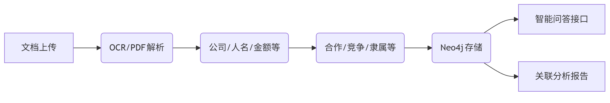graph LR 文档上传 --> 文本提取(OCR/PDF解析) 文本提取 --> 实体识别(公司/人名/金额等) 实体识别 --> 关系抽取(合作/竞争/隶属等) 关系抽取 --> 知识图谱构建(Neo4j存储) 知识图谱构建 --> 智能问答接口 知识图谱构建 --> 关联分析报告