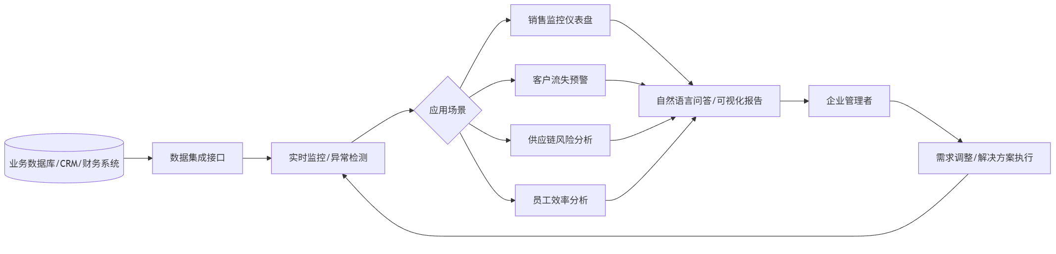 graph LR 数据层[(业务数据库/CRM/财务系统)] --> 集成层[数据集成接口] 集成层 --> 分析层[实时监控/异常检测] 分析层 --> 应用层{应用场景} 应用层 --> A[销售监控仪表盘] 应用层 --> B[客户流失预警] 应用层 --> C[供应链风险分析] 应用层 --> D[员工效率分析] A & B & C & D --> 交互层[自然语言问答/可视化报告] 交互层 --> 用户[企业管理者] 用户 --> 反馈层[需求调整/解决方案执行] 反馈层 --> 分析层