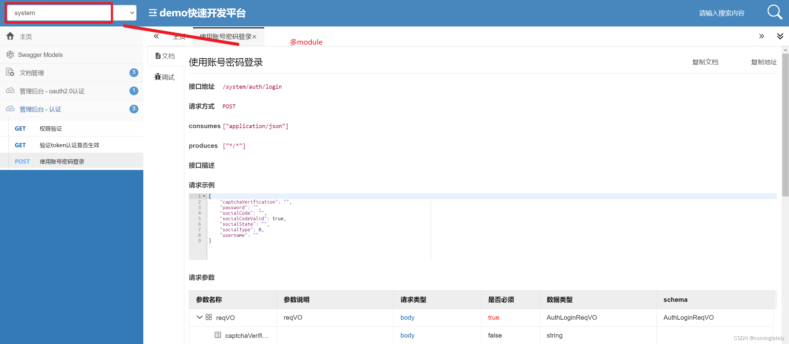项目使用swagger提供接口文档功能, 下面演示下多module的springboot 项目是怎么配置。通过为每个module设置独立的分组,完成分组切换功能, 下面举个例子。