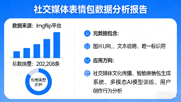 摘要 本研究分析了Imgflip平台的202,208条表情包数据,涵盖81种流行模板。数据集包含完整图片URL、文本说明和元数据,具有100%完整性。分析显示数据平均文本长度为62.5字符,模板分布均衡(如Success Kid占1.37%)。该数据集支持多种应用场景,包括NLP模型训练(文本生成、情感分析)、社交媒体文化研究(流行趋势追踪)、多模态AI开发(图文匹配)以及内容推荐系统。数据优势体