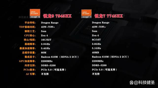 但是,锐龙7 7745HX只有8核心16线程,最高加速频率5.1GHz,性能上与锐龙7 7840H差别不大。然而,锐龙9 7945HX却拥有完整的16核心32线程,CPU多核算力甚至超越了13代酷睿中皇帝级别的i9-13980HX,也是2023年度笔记本领域的天花板。锐龙7040H平台采用4nm工艺,Zen3+RDNA3微架构的组合不同,锐龙7045HX平台改用了5nm制程工艺,Zen 4+RDN