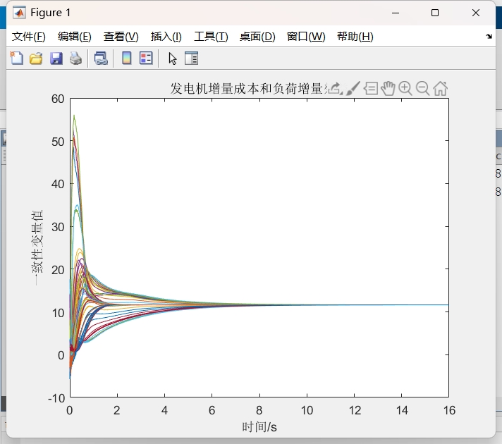 程序的主要思路是通过迭代计算,不断更新发电机和负荷的一致性变量值,以及发电机和负荷的出力和功率分配方案,直到达到系统的最优状态。在每一次迭代中,根据当前的一致性变量值和出力分配方案,计算出新的一致性变量值和修正后的出力分配方案,然后再进行下一次迭代,直到达到预定的迭代次数或收敛条件。程序的主要思路是通过迭代计算,不断更新发电机和负荷的一致性变量值,以及发电机和负荷的出力和功率分配方案,直到达到系统