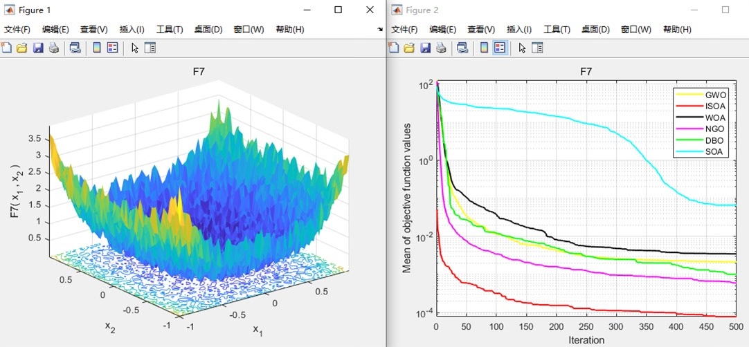 改进的海鸥优化算法(ISOA,2019年算法)基础的SOA算法性能较差,改进后效果不错。最大迭代次数:500独立运行次数:30初始种群数量:30对比算法:GWO,WOA,NGO,DBO,SOA基础测试函数收敛曲线如下且给出对应测试函数图形。代码中对哪处采用了什么改进方式有中文注释,拿到手直接运行main文件,直接出下面对比图,及最优值平均值标准差等信息。可以看出改进后的ISOA拥有较高的收敛速度与