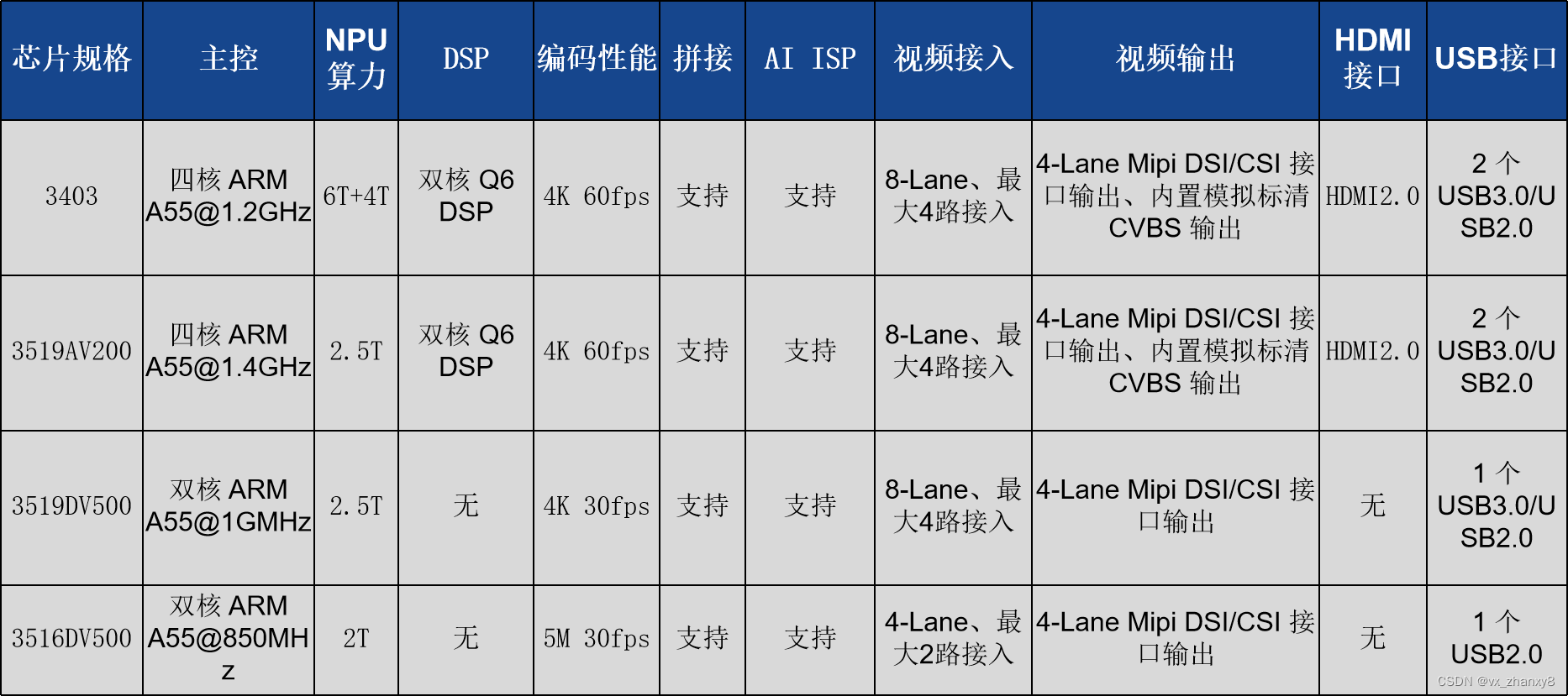 海思越影3516DV500/3519DV500/3519AV200/SD3403系列的回归基本上把原来停产的几个主力产品都补齐了,除了图像上的提升,音频的接入能力也有了大幅的提升,3516DV500和3519DV500都支持麦克风阵列的输入,对音视频一体化的产品更加的友好,同时新一代的3516DV500和3519DV500都内置了DPU,对3D视觉产品的开发更加便利。