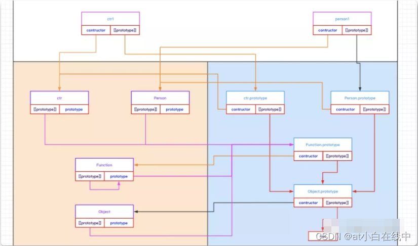 三、constructor// true四、实例与原型、原型的原型实例与原型当读取实例的属性时,如果找不到,就会查找与对象关联的原型中的属性,如果还查不到,就去找原型的原型,一直找到最顶层为止。//删除person name 属性。