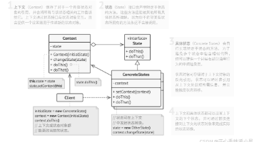 状态模式是一种行为设计模式,允许对象在内部状态改变时改变其行为。本文通过Java线程状态实例展示了该模式的实现,包括NewState、RunnableState、BlockedState和TerminatedState等具体状态类,每个状态类都实现了ThreadState接口,并根据当前状态定义了不同的行为转换规则。上下文对象(ThreadContext)通过改变其状态对象来改变自身行为,使状态转