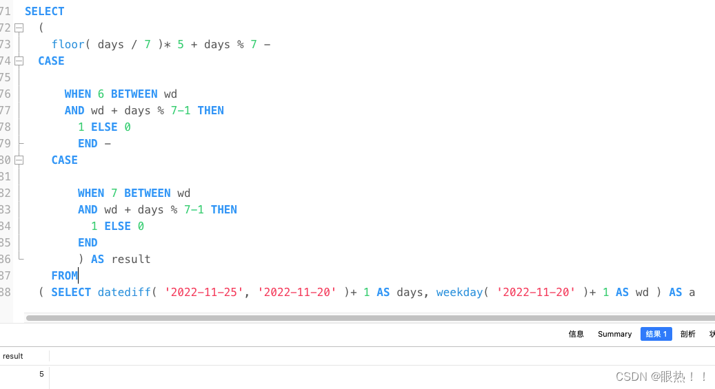 mysql计算两个日期之间的工作日(可跨年,排除周六日,不排除节日)