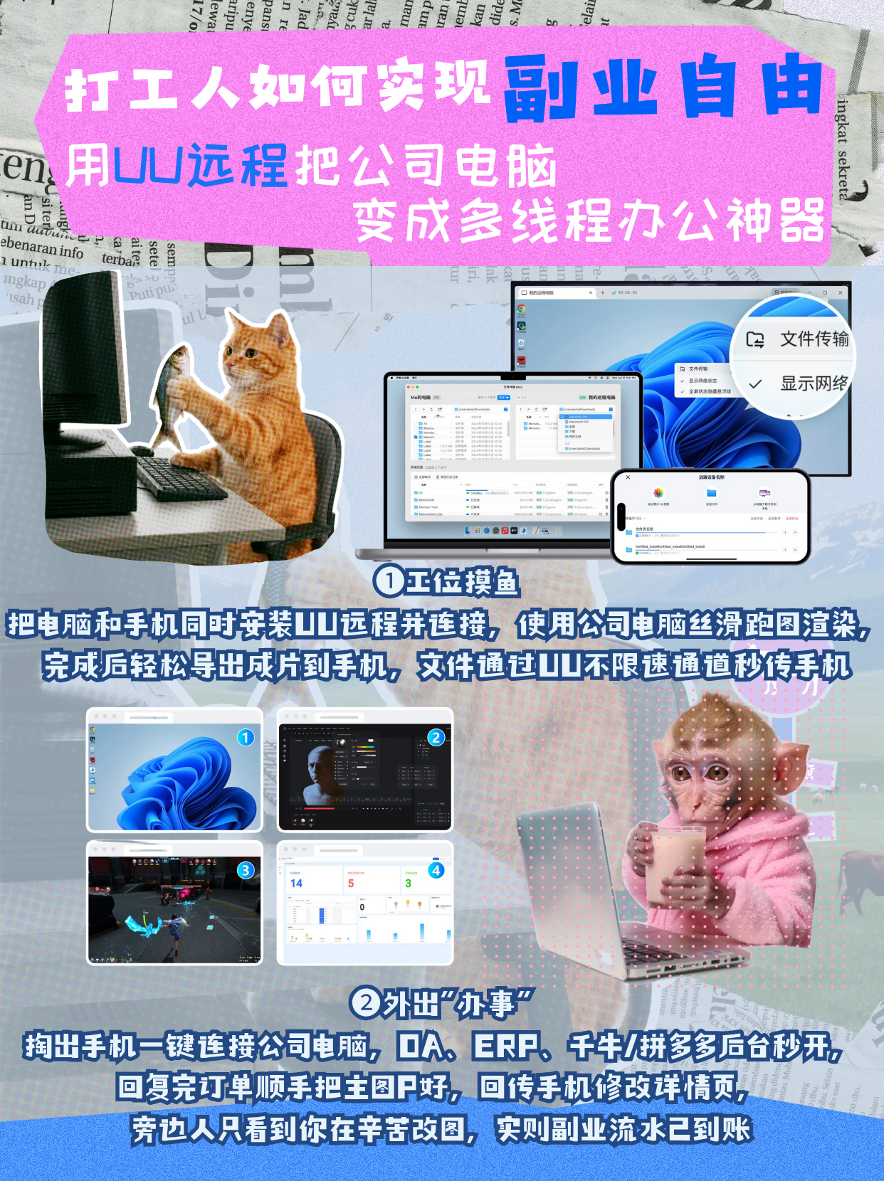 掏出手机一键连接公司电脑,开启多屏协作模式,OA、ERP、千牛/拼多多后台秒开,回复完订单顺手把主图P好,回传手机修改详情页,旁边人只看到你在辛苦改图。用UU「关闭显示屏」+「静音运行」,剪映、PR、Python爬虫在后台静默跑;手机躺床上就能监视进度,第二天上班还能接着修改。收入装进自己口袋,主业绩效还不掉线——这就是打工人的“第二台隐形电脑”!,文件通过UU不限速通道秒传手机,全程无弹窗、无拷