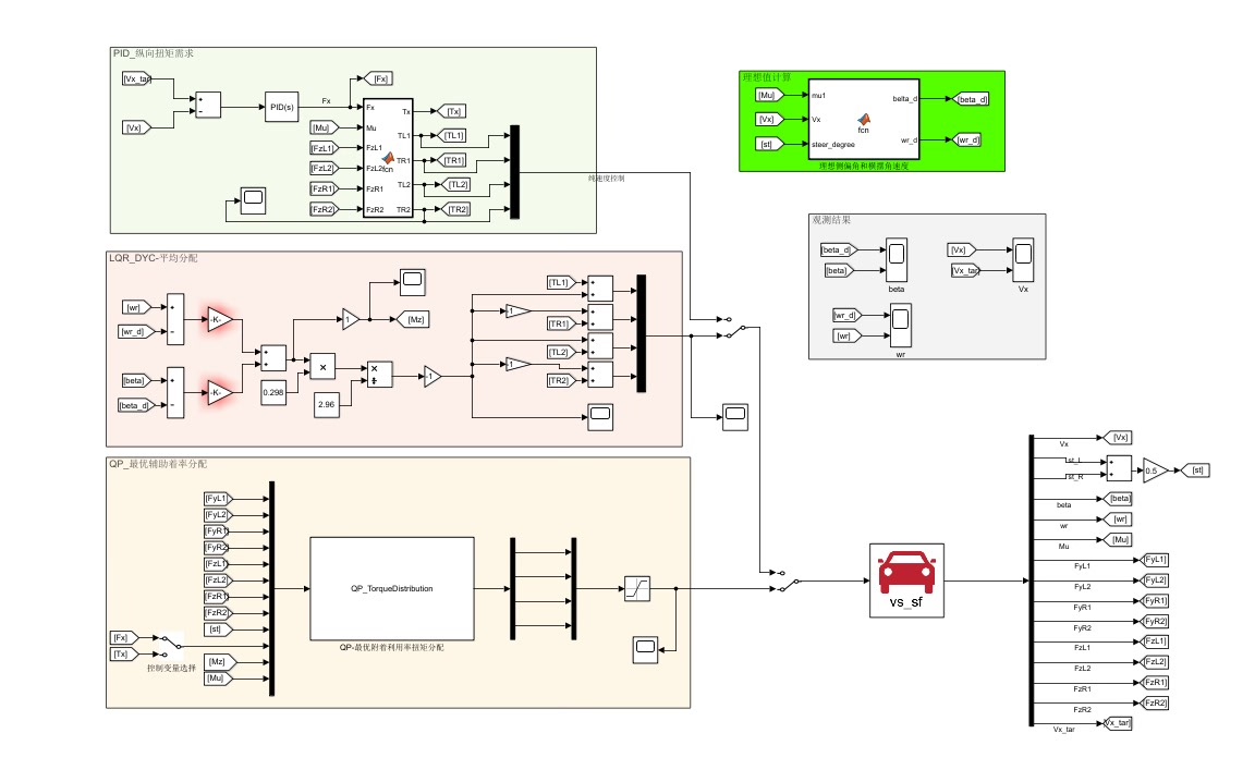 分布式驱动电动汽车LQR DYC 直接横摆力矩控制 最优/规则扭矩分配控制pid计算纵向扭矩需求, 上层lqr计算 下层最小附着利用率分配 扭矩分配效果优良 稳定性控制 操纵稳定性 matlab simulink代码源码 carsim联合仿真 二次规划,理想质心侧偏角横摆角速度期望值与真实值的偏差作为模型输入。当车速80km/h,方向盘转角阶跃输入后,带LQR控制的车辆横摆角速度超调量比传统PID