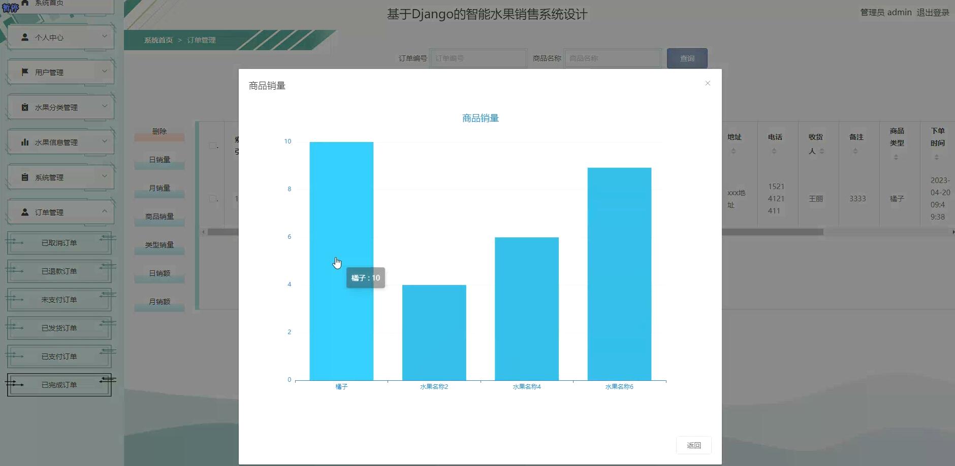 Echarts+Python水果销售系统包含用户和管理员的角色,用户可以查看水果信息、收藏、添加购物车购买、评价水果、查看水果宣传知识等,管理员可以管理员水果的宣传知识、管理分类、水果的信息、接受订单发货、对销量进行可视化的统计。