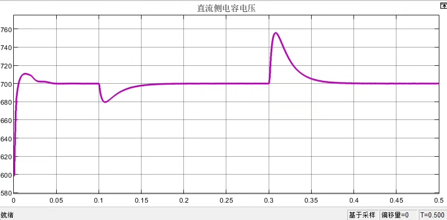 这个仿真模型最让我惊艳的是各环节的配合默契度——当DC/DC在0.3秒突然切到放电模式时,VSR能在10ms内调整功率平衡,整个过程母线电压仅下跌6V就快速恢复。三相PWM变流器控制:采用电压外环、电流内环双闭环PI控制,电压环稳定直流测电容电压700V,电网电压和电容电流前馈,电感电流解耦,且使用SVPWM空间矢量调制。三相PWM变流器控制:采用电压外环、电流内环双闭环PI控制,电压环稳定直流测