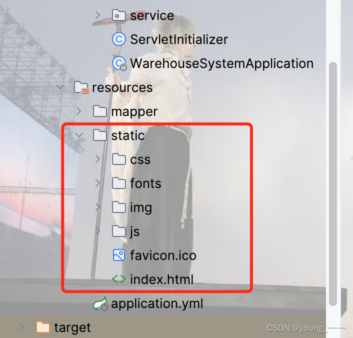 让其继承一个类:SpringBootServletInitializer,并且覆盖 configure 方法,在方法中添加 return builder.sources(WarehouseSystemApplication.class);将Vue项目dist文件夹下的所有文件Copy到SpringBoot项目的resource/打包完成后项目路径下会生成一个新的文件夹dist,打包后的东西都在里面