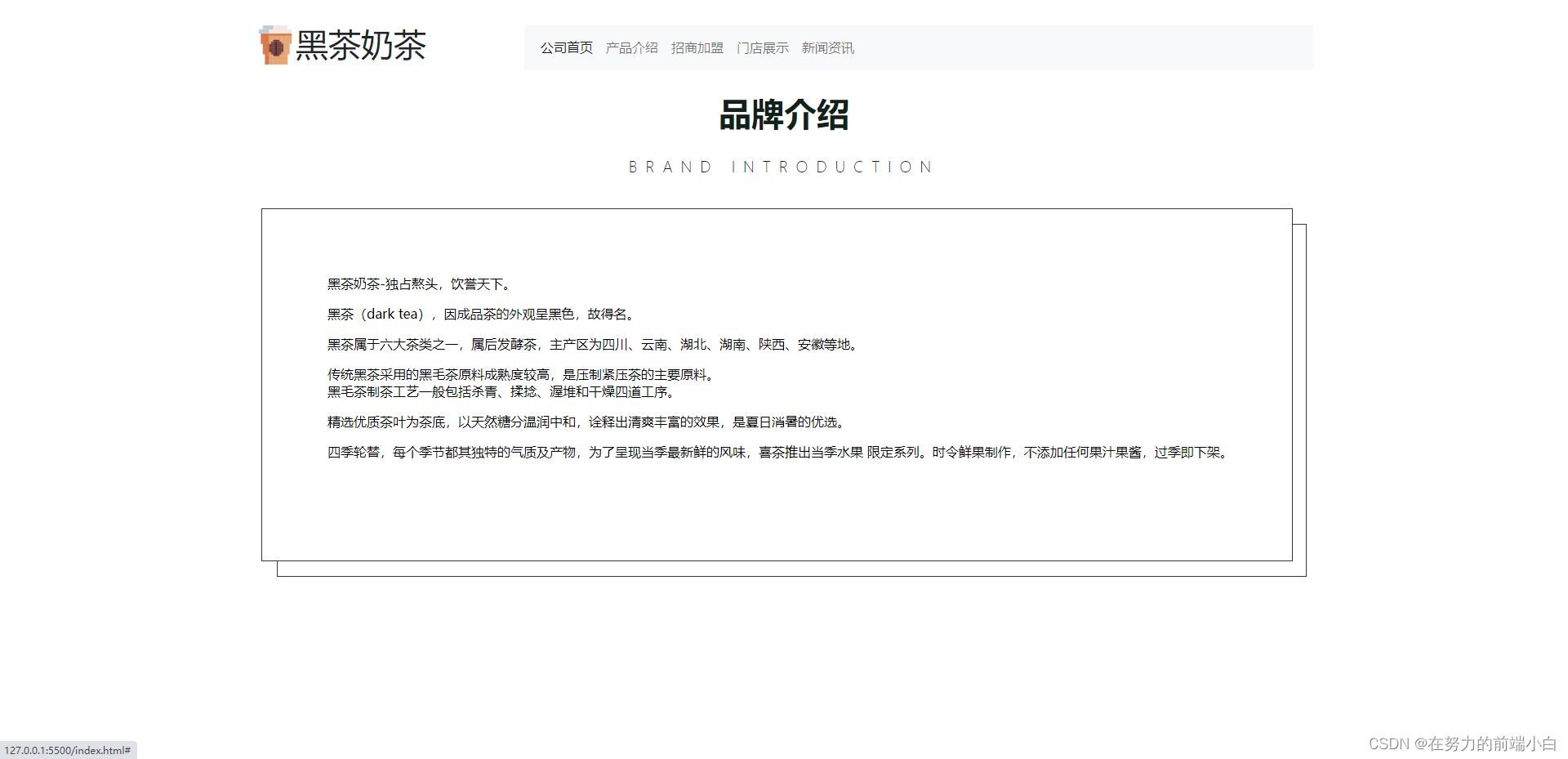 空余时间无聊写的网页,喜欢的可以联系目的:奶茶等饮品属于大众消费,消费者甚多,主要以青少年为主,不管是现在的市场需求及未来的市场需求都是不低的,奶茶作为新饮品已经以其旺盛的生迷离占据个人创业榜榜首。在商机无限的现代社会,奶茶的时尚引力、繁多口味、独特口感、健康特色注定使他继续站稳快销行业的脚步。关于企业文化的具体介绍店面产品的简介加盟说明界面门面咨询界面关于行业新闻的简介网站界面简介明了网站内容吸