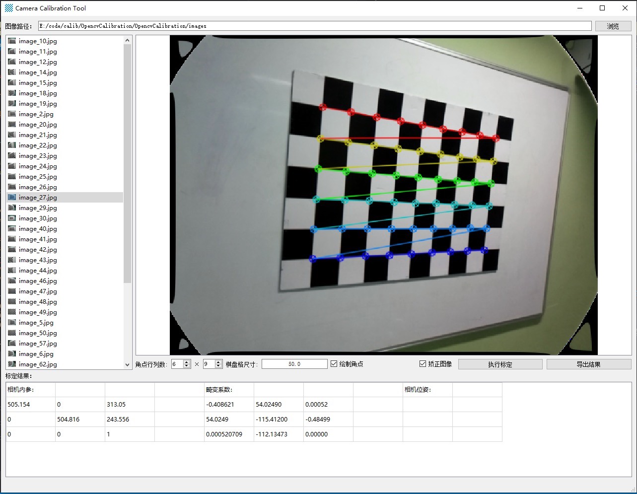 基于Opencv4.7.0开发的棋盘格标定助手资源名称:Opencv棋盘格标定助手版本信息:Visual Studio 2022、QT5.9.9主要功能:针对使用棋盘格标定板的相机内参标定。技术要求:Window10/11 x64,Opencv使用说明:导入棋盘格图像和设置相应的角点和格子尺寸就可以直接标定相机内参了,畸变系数默认使用了8个,可以在代码中自行设置,附带了结果导出。
