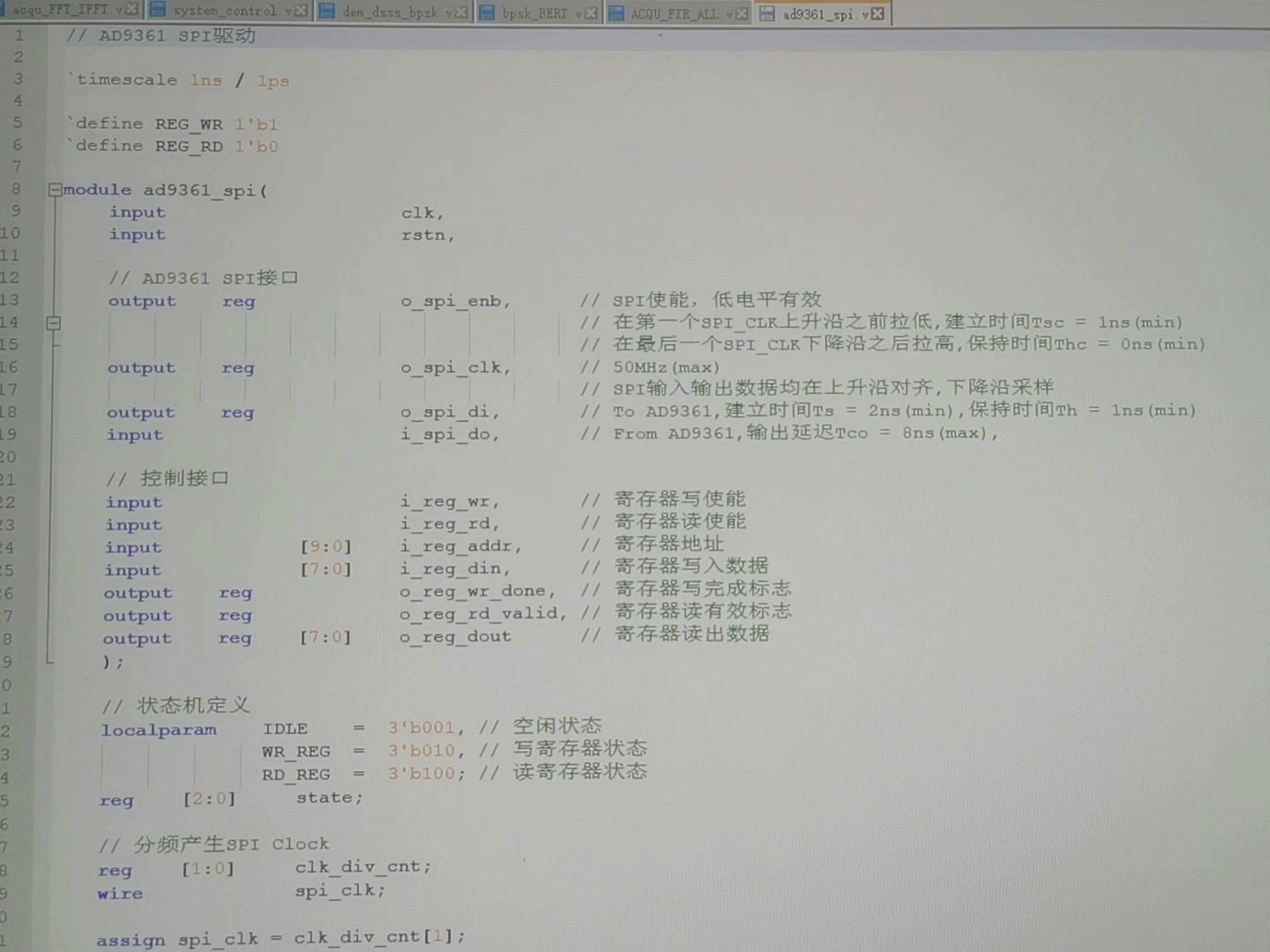 这时候拿频谱仪对着射频口,能扫到干净的单音信号——这时候千万别激动,先检查是不是本振泄露,把数字直流校正寄存器配置好再说。这里有个骚操作,把12bit的I/Q信号拼成24bit总线,后面接FIFO的时候能省一半带宽。AD9361纯逻辑FPGA驱动,单音信号收发例程,可动态配置9361,verilog代码,Vivado 2019.1工程。工程里最坑的是Vivado的时钟约束,必须给AD9361的da