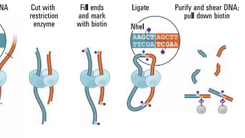 再次打断片段,用磁珠将生物素标记的片段捕获,制备测序文库,上机测序。具体包括:全基因组范围的顺/反式相互作用、染色质区室A/B Compartment、TAD(Topologically associating Domains,拓扑结构域)和染色质环等(Chromatin loops)。订单/实验材料确认——样品准备及预处理——酶切——末端修复,引入生物素标记——连接——解交联DNA,提取建库——