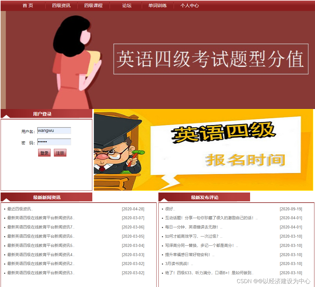 基于SSM开发在线四级教育平台(前台+后台 老师 学生 管理员):(毕业设计/课程设计)开发工具: MyEclipse+Jdk+Tomcat+MySQL数据库演示视频:javaweb基于SSM开发在线英语教育平台源码运行效果图: