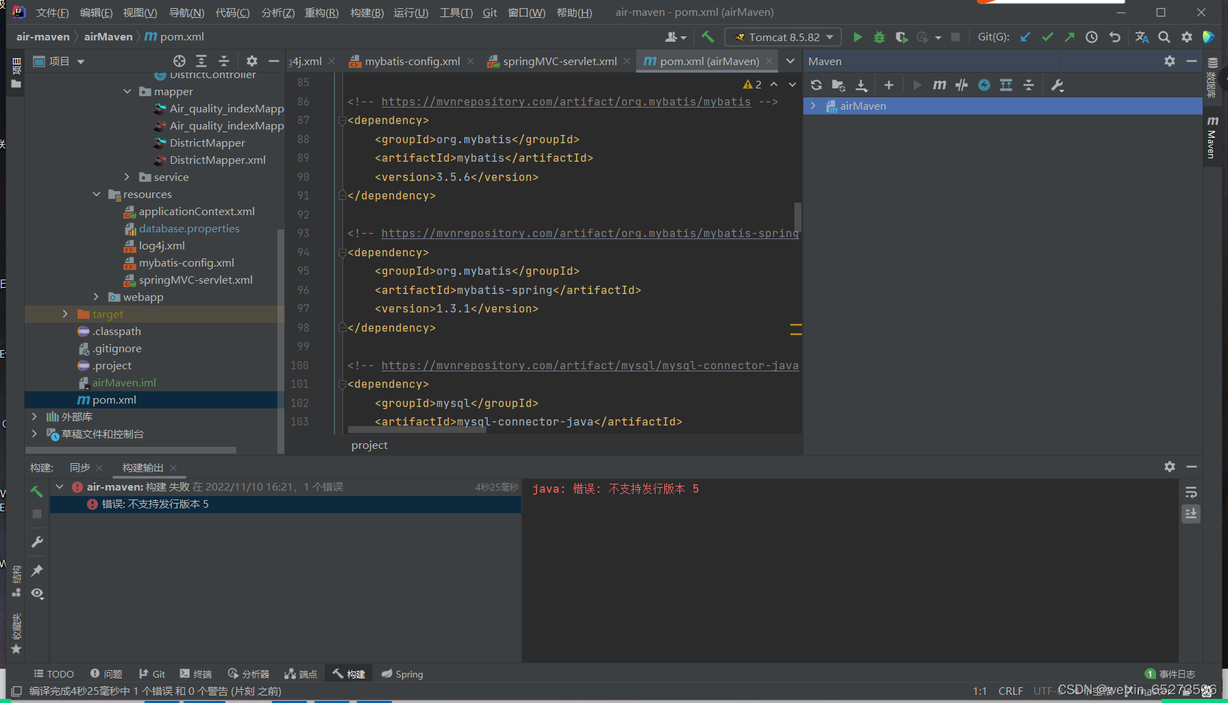 今天在网上拷了份javaSpring项目来研究学习,把数据库啥的都配置好了后弹出了java:错误:不支持发行版本 5;