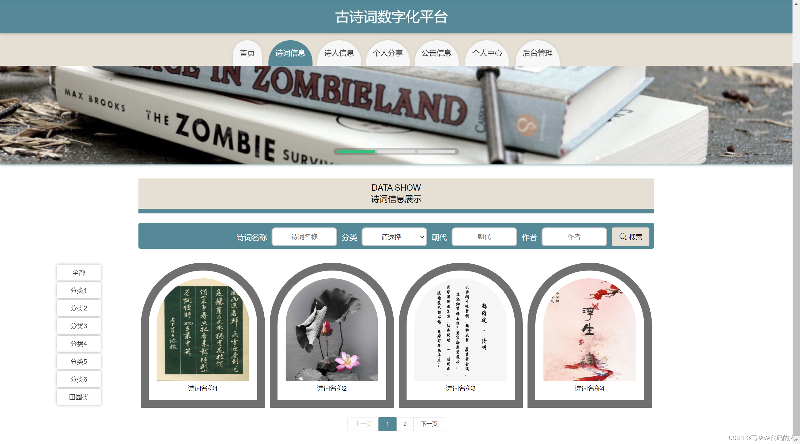 古诗词数字化平台的功能已基本实现,主要实现主页、个人中心、用户管理、诗词信息管理、分类管理、诗人信息管理、个人分享管理、系统管理等功能的操作系统。