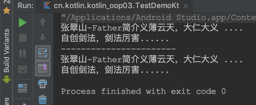 父类 张翠山:/**// 注意:⚠️ 必须此类默认是不被其他类继承的,如果想被其他类继承 需要加入 open 修饰// 注意:⚠️ 必须此成员变量默认是不被其他类使用的,如果想被其他类使用 需要加入 open 修饰open var personDescribe:String = “义薄云天,大仁大义 …”/**/**子类 张无忌:测试 的 main方法:// 先打印父类的信息 张翠山// 打印子类