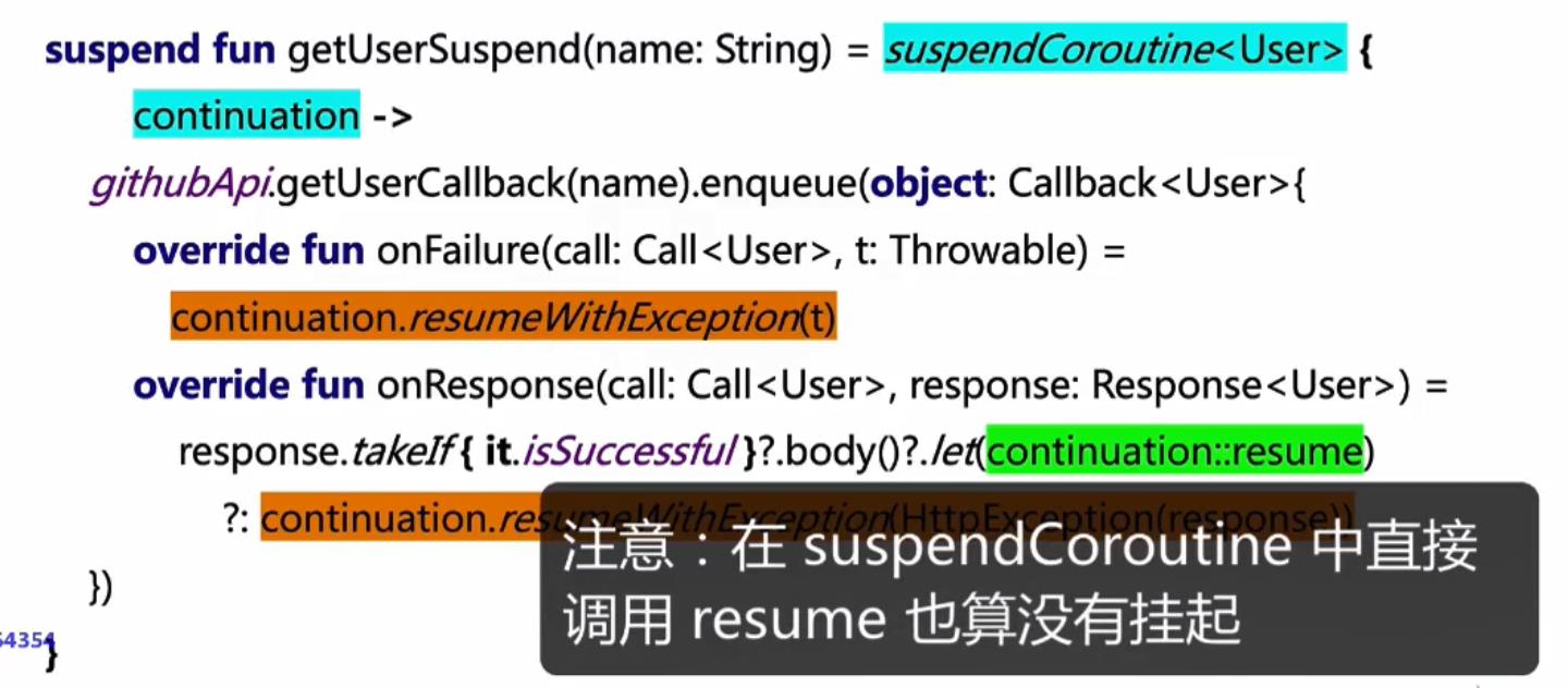 suspend fun getUserSuspend(name: String) = suspendCoroutine { continuation ->githubApi.getUserCallback(name).enqueue(object: Callback{override fun onFailure(call: Call, t: Throwable) =continuation.res