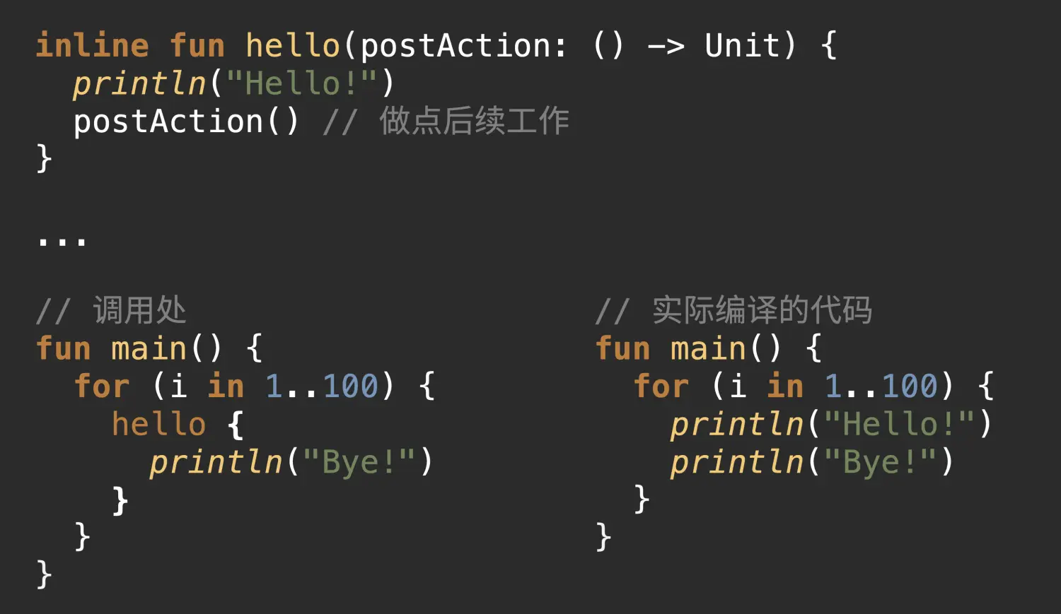 1.inline的作用1.1 可以将函数体直接复制到函数调用处package com.example.kotlinsyntax._inlineclass InlineClass {//inline标记的函数inline fun doInline() {print("inline")}//普通函数fun doNoInline() {print("noInline")}//调用处函数fun test