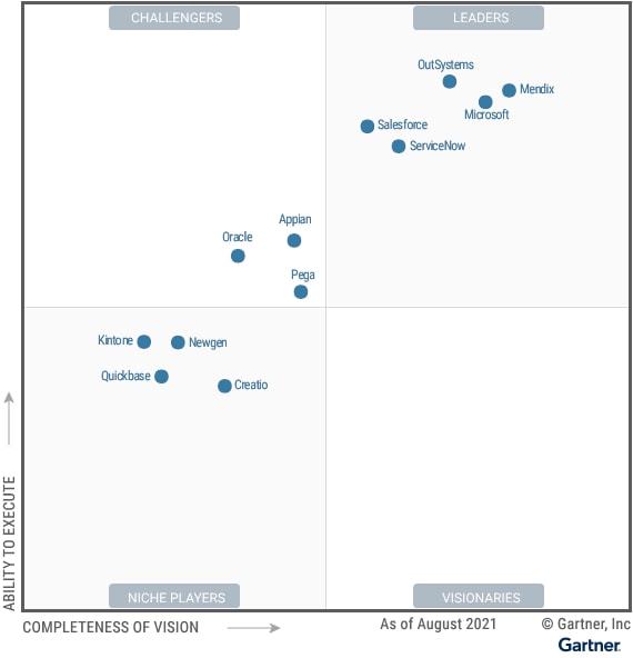 前段时间,国际知名咨询研究机构Gartner发布了《2021年企业低代码应用平台魔力象限》。此研究内容是Gartner通过产品操作、服务、市场反馈、用户影响力、客户体验、营销执行等等,多个维度对全球知名厂商进行了严格评选。(国内低代码厂商不包含在内)其中,OutSystems、Mendix、微软、Salesforce、ServiceNow被评为行业领导者;Appian、Oracle 和 Pega被