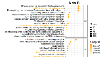 CC共富集到93个通路,富集的top5通路分别为:呼吸链复合体(respiratory chain complex)、线粒体呼吸体(mitochondrial respirasome)、线粒体呼吸链复合体I(mitochondrial respiratory chain complex I)、NADH脱氢酶复合体(NADH dehydrogenase complex)和呼吸链复合体I(respir