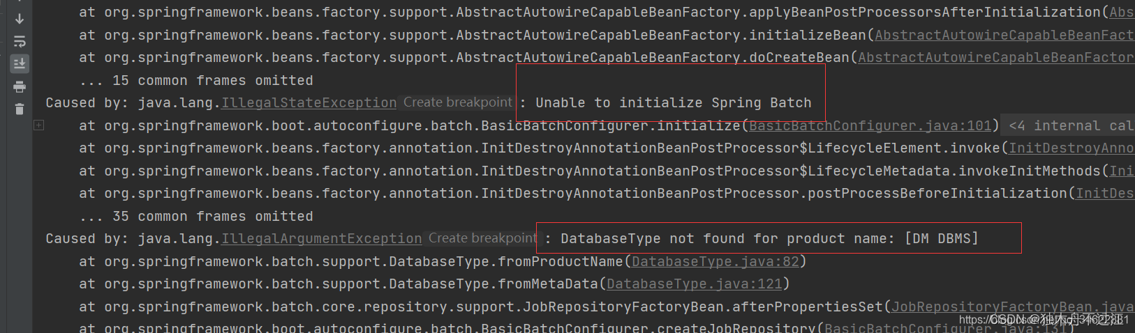 1.SpringBatch中的 org.springframework.batch.support.DatabaseType 枚举类。原因:Spring(Batch) 不兼容达梦数据库,源码中没有达梦的数据类型和驱动匹配。SpringBatch使用达梦数据库报错。严格按照类名修改后,项目成功运行。