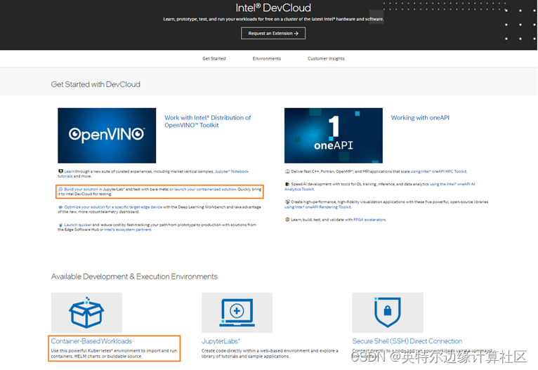 概况介绍Intel® DevCloud平台为每个注册用户提供独立的沙箱运行环境,并构建了完整的软件栈,开发者登录后不需要对环境做任何配置,不用担心软件之间的兼容问题,即可使用浏览器随时随地访问Intel® DevCloud上的算力资源、官方提供的丰富教程和参考实例。 “开箱即用”的用户体验,想开发者所想!Intel® DevCloud容器化应用部署平台已经上线,开发者可以在丰富的边缘节点上运行容器