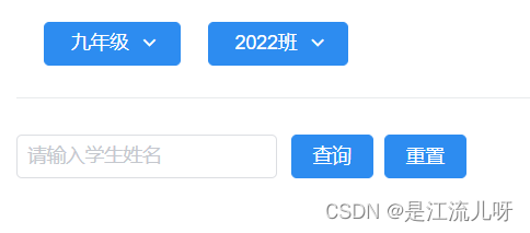 重置按钮功能: 按钮代码:图示:1.初始化查询数据:2.图示方法: 重点就是这句:(意思是将初始状态的data复制到当前状态的data,实现重置效果) 以上是简单的重置按钮功能;以下是:在有下拉菜单Dropdown 的情况下使用重置按钮就是另一种写法: 这里默认选择了年级和班级,用第一种方法,点击重置按钮,会将下拉菜单从默认状态选择变成需要选择的状态重置按钮功能(有下拉菜单情况下适用): 1.初始