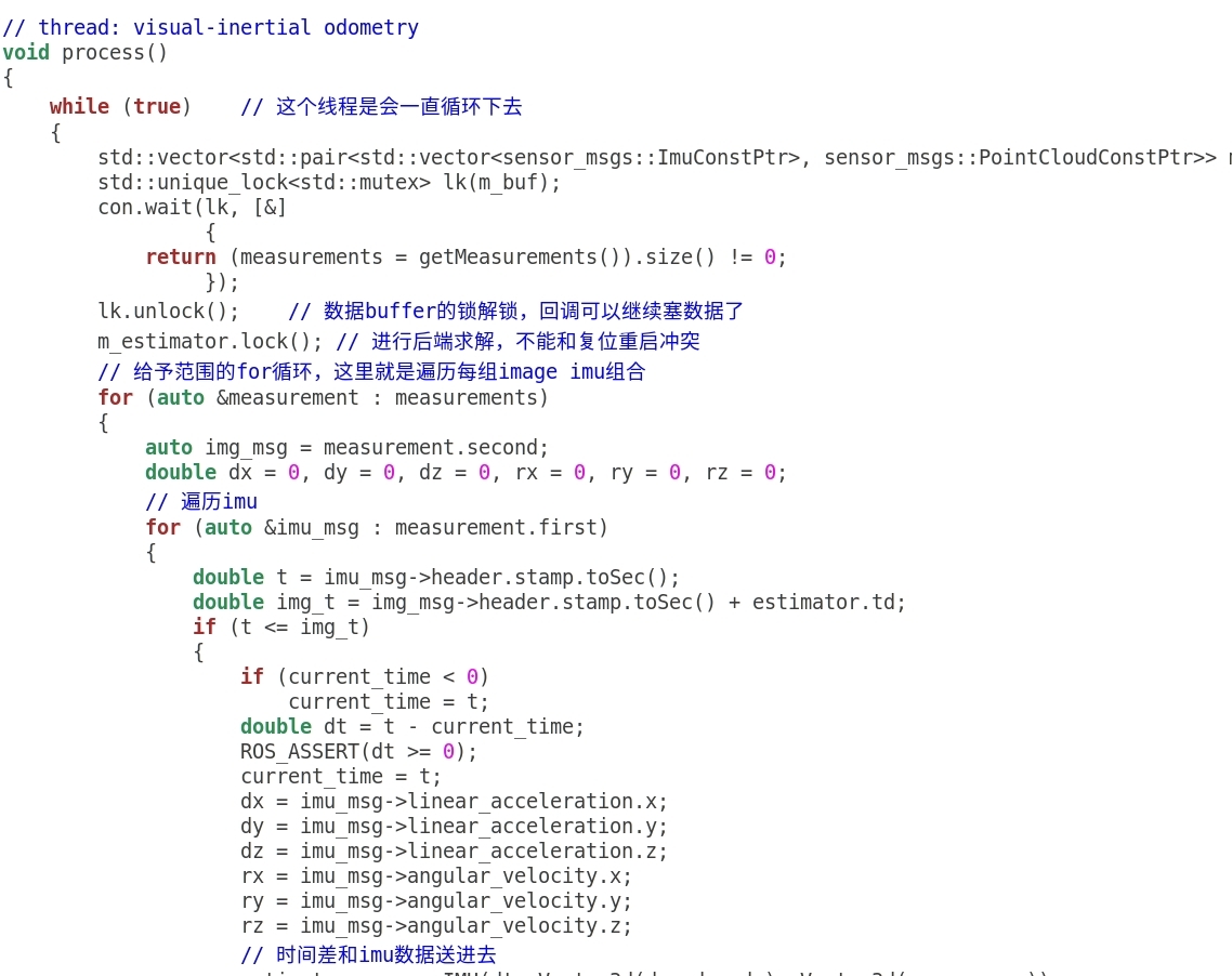 实际跑起来你会发现,即便在纹理稀疏的墙面,它也能维持稳定的特征密度,比OpenCV原生的特征检测更抗环境变化。先看特征跟踪这个最吃性能的环节。这套组合拳在低纹理环境下依然坚挺,实测在商场玻璃幕墙场景,当特征点数量掉到30以下时,还能稳定输出初始位姿,比传统八点法靠谱多了。安装环境配置文档及编译运行文档,附带可测试的开源ROS数据包, 代码主干部分带有中文注释,并提供大框架梳理的思维导图。安装环境配