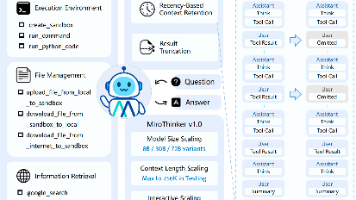 MiroThinker采用单智能体ReAct框架,以“思考(T)-行动(A)-观察(O)”三元组构成交互轨迹,形成迭代循环。图左侧三大工具:执行环境(执行Shell命令和Python代码等)、文件管理、信息检索:包含谷歌搜索工具(返回结构化结果)和网页抓取工具(结合轻量LLM提取任务相关信息)。