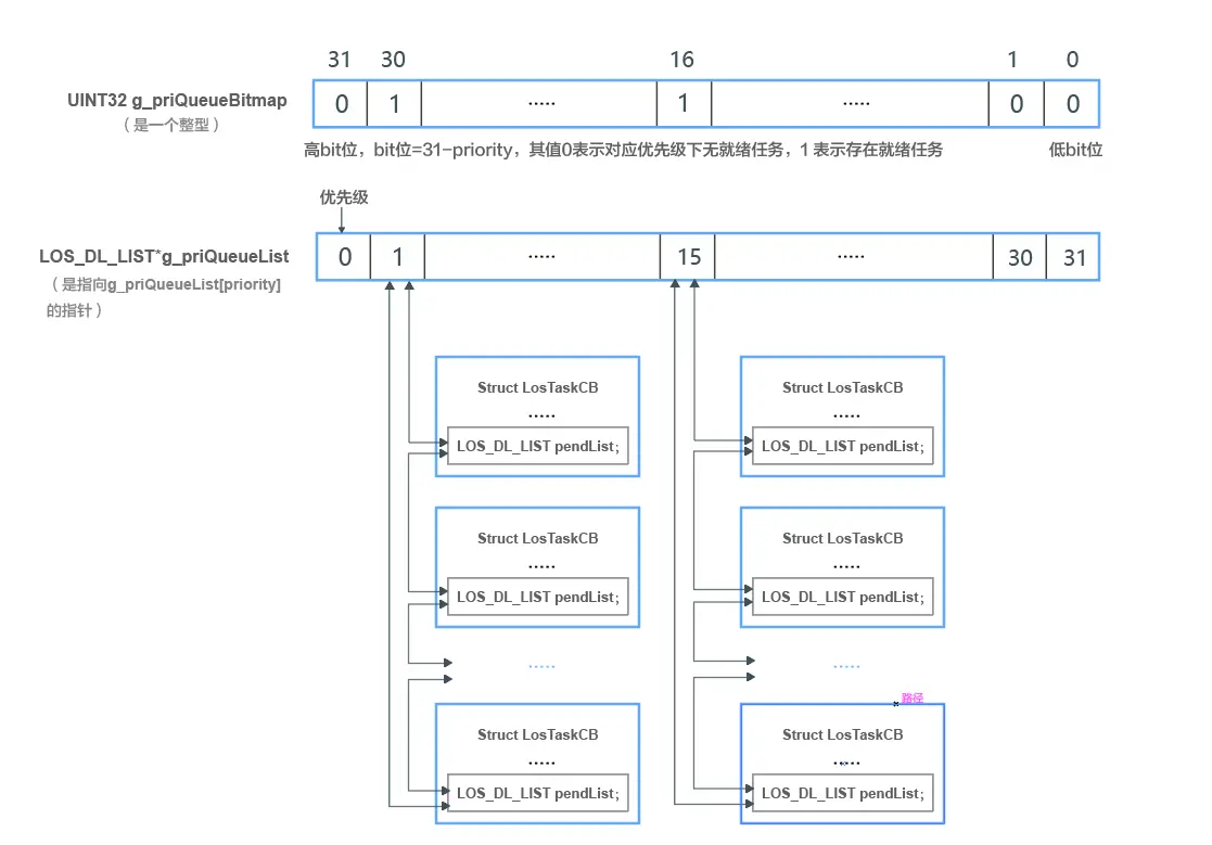 在文件中定义了和任务就绪队列相关的主要变量。其中⑴表示任务就绪队列,是一个双向链表数组,后文初始化该数组时会将数组长度设置为⑷处定义的;⑵表示优先级位图,标识了任务就绪队列中已挂载的就绪任务所在的优先级;⑶表示优先级为0的比特位;⑷表示任务就绪队列支持的优先级个数32,所以鸿蒙轻内核优先级的取值范围为0-31,数值越小优先级越大。优先级位图的bit位和优先级的关系为,优先级数组包含了个数组元素,每