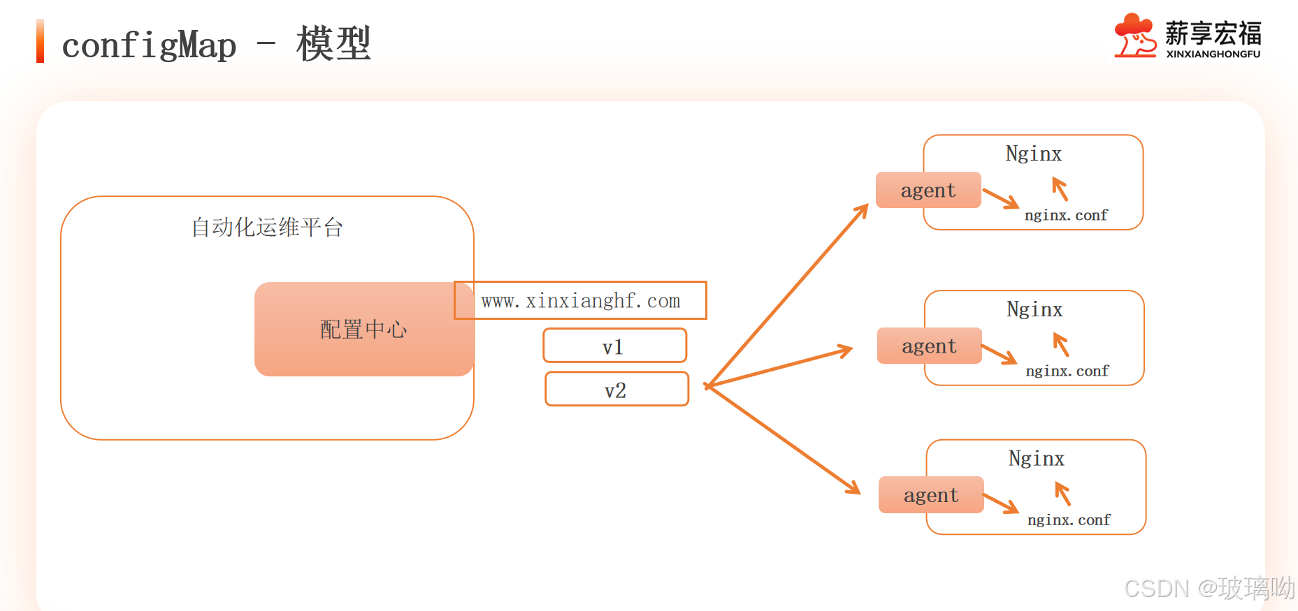 这时候引出了配置中心ConfigMap(如果不能满足需求可以开发自定义配置中心),首先会在每个节点上安装一个agent端,agent端的作用就是监控配置中心的资源是否发生更新动作,如果有agent端就会去配置中心下载最新的配置文件来替换当前的,然后出发nginx重载,使配置生效。但是它会使用其本地缓存的数值作为secret的当前值。所以当第一次注入的时候第一个文件产生了一个链接(有且只会有这一个链