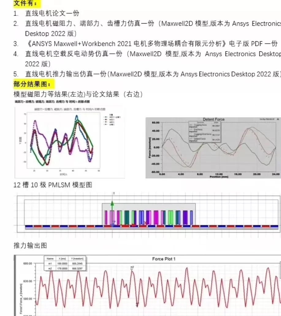 12槽10极平板型永磁同步直线电机仿真,12槽10极平板型永磁同步直线电机仿真,包括:1.复现一份2.直线电机制动力仿真模型一份3.直线电机空载反电动势波形和推力输出模型一份12槽10极平板型永磁同步直线电机,绝对是直线电机里的“国民款”——短距配合天生齿槽转矩低,推力波动小,不管是练手仿真还是实际项目都好使。今天咱就把复现、制动力、空载反电动势+推力这三个仿真模块唠明白,代码和分析都给你们扒得明