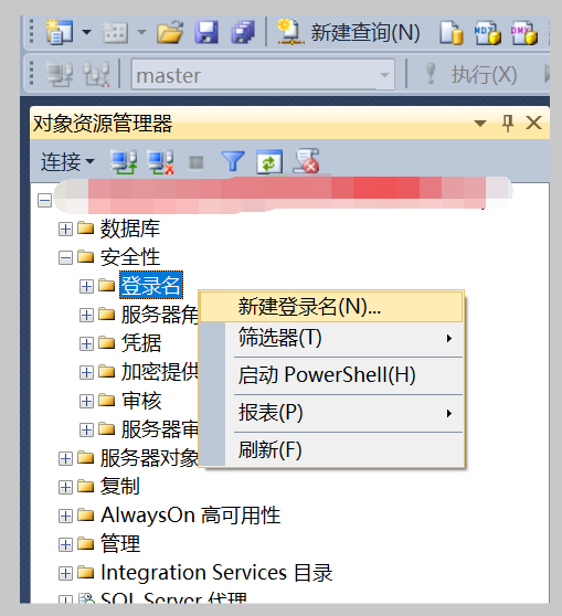 如果登录后发现目标开放的数据库无法读取且库中无表格,需要进入到所新增的用户的属性中,重新勾选第四步,并确认,刷新安全性—登录名,重新登录一般即可解决.如账户名已建立成功,则可以进行登录,此时测试自己开放的权限,只能查看第四步用户映射的内容,权限为只读(datareader,后续可按需调整),5.安全对象的登录名显示的是新建立的用户名,点击搜索,之后选择服务器xxx(看个人选择),同时勾选下放的sq