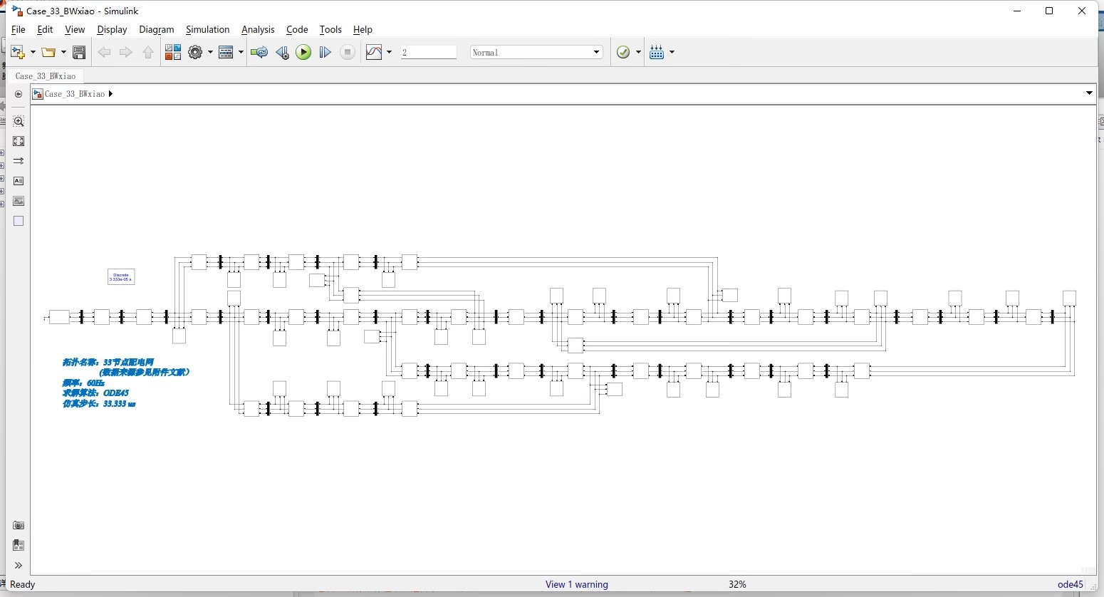 IEEE33节点配电系统是国际上广泛采用的标准测试系统,它能够很好地模拟实际配电网的运行特性。该系统包含33个节点、38条线路,具有丰富的网络拓扑结构和负荷分布特点,特别适合用于配电网潮流计算和可再生能源并网研究。通过本次研究,我们成功构建了一个基于Simulink的IEEE33节点配电网模型,并对其运行特性进行了深入分析。该模型不仅能够实现节点电压电流数据的实时采集,还为风光能源并网研究提供了良