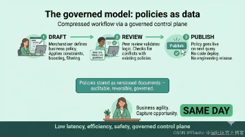 本文探讨了电商搜索治理中受管控控制平面的创新方法。通过将搜索策略从代码中解耦为结构化数据,业务团队能够在数小时内直接修改搜索行为,无需工程部署。文章对比了传统模式下需要数周工单流程的局限性,展示了新模型如何通过"策略即数据"实现快速迭代,包括策略编写、测试、审批和即时生效的全流程。这一转变不仅提升了业务响应速度,还改善了问题归因能力,使搜索治理成为数据驱动的过程。最后,文章指出