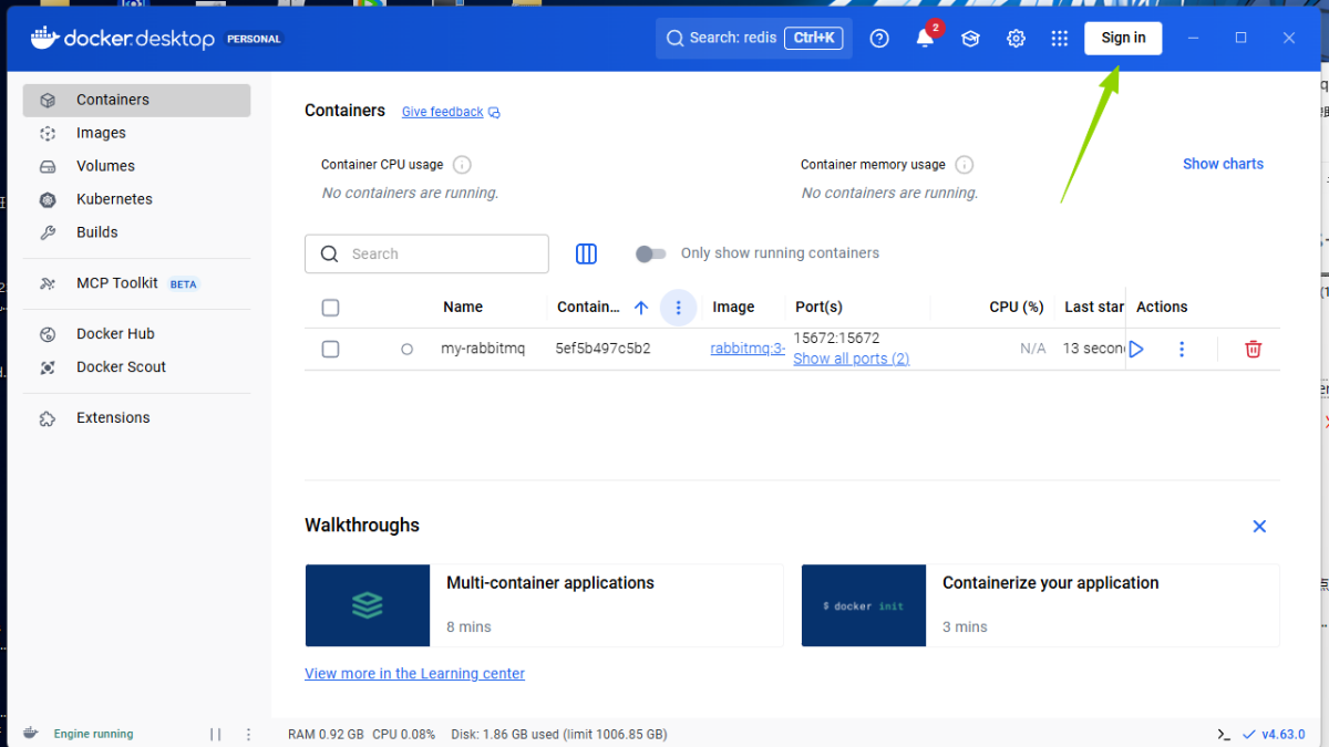故此我又想到了直接从命令行/shell中直接通过拉取国内镜像rabbitmq资源包进行下载,到这里我就突然想起来,我不是用desktop安装rabbitmq么。又整个人陷入无语中,但是也无办法,继续。安装完成后,我是直接选择了跳过登录,直接进入到Docker-desktop图形化界面(因为本机电脑科学上网环境不好。此图片来源于csdn @JavaDog程序狗,因为我下载时点击快了,没有截图保存到。