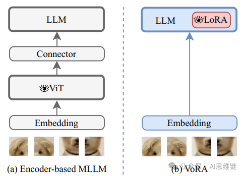 多模态大语言模型(MLLMs)通过模块化设计将预训练视觉模型与大语言模型(LLMs)集成,取得了显著进展:如图1(a)所示,视觉编码器提取的视觉特征通过连接器与大语言模型对齐。虽然这种方法在训练中效率较高,但由于依赖外部视觉专家模型,存在关键局限性,即额外的计算成本和图像分辨率限制。例如,许多视觉编码器,特别是视觉变换器(ViTs),遵循固定分辨率的训练范式,限制了灵活性。此外,模块化设计采用顺序
