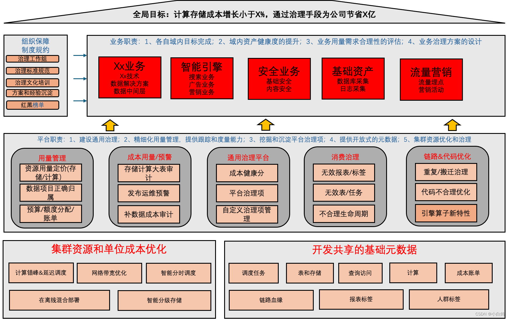 术业有专攻,尤其是传统行业的业务人员对数据的认知处于比较浅的层次,想要在转型过程中,数据团队不是闭门造车,而是深刻的理解了业务流程和痛点,就需要具备深厚的数据功底的“外交官”的角色,去不断深入业务过程,可以告诉业务数据能够带来哪些改变,现有哪些数据,还需要做哪些工作。既然数字化转型的终极目的是降本增效,以终为始,那就要先看目前的经营流程中,主要的“本”花在了哪里,这时涉及两个层面,一是要能够梳理清