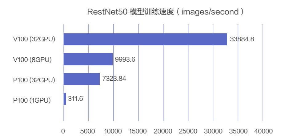 GPU 硬件升级的加速效果显著。从单卡的算力看,pascal 架构为代表的 P100 一秒钟只能处理 300 张图片,而 volta 架构的 v100一秒钟可以处理 1200 张图片,提升了 4 倍。分布式训练的也是有效加速的方式。从单卡 P100 到分布式 32 卡 v100,可以看到训练速度提升了 300 倍。1. 模拟数据训练速度而从训练时间来看,同样的数据,同样的训练目标,单卡 P100